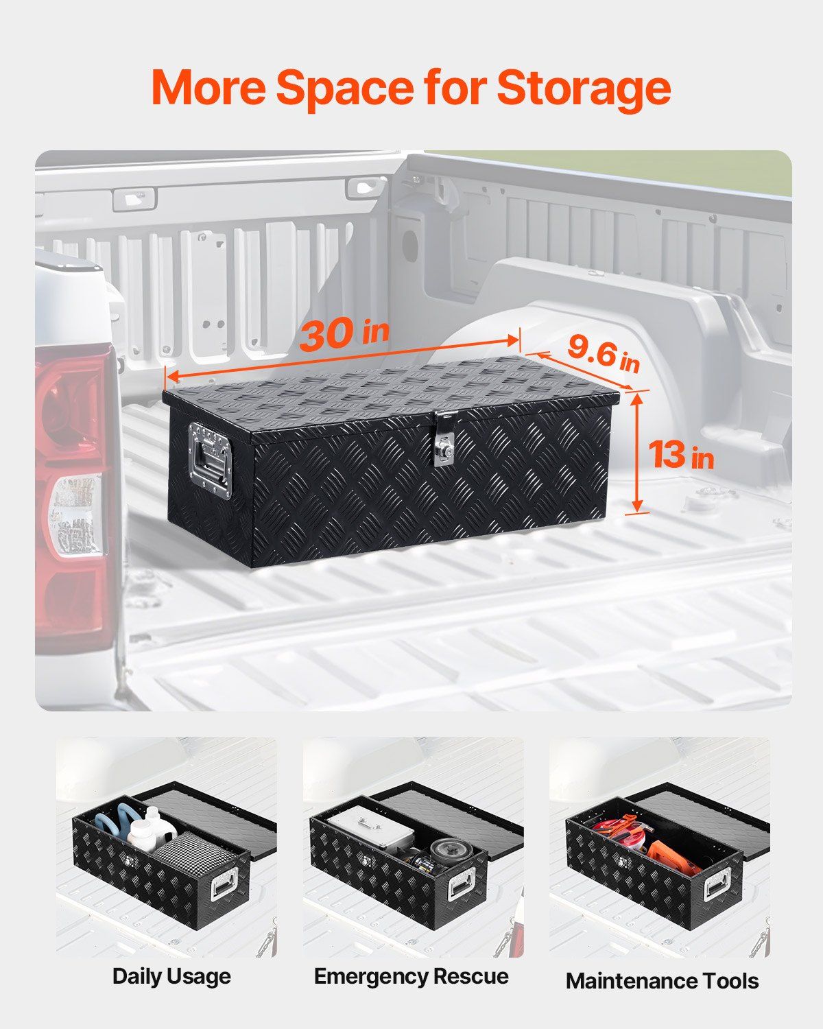 1.Large Storage Capacity: This spacious truck bed tool box measures 30 x 13 x 9.6 in / 762 x 330.2 x 243.84 mm, providing ample space to store buckets, maintenance tools, fire extinguishers, warning signs, or camping and fishing gear in your truck. It is commonly used for pickup trucks, trailers, RVs, and is also suitable for home and warehouse use