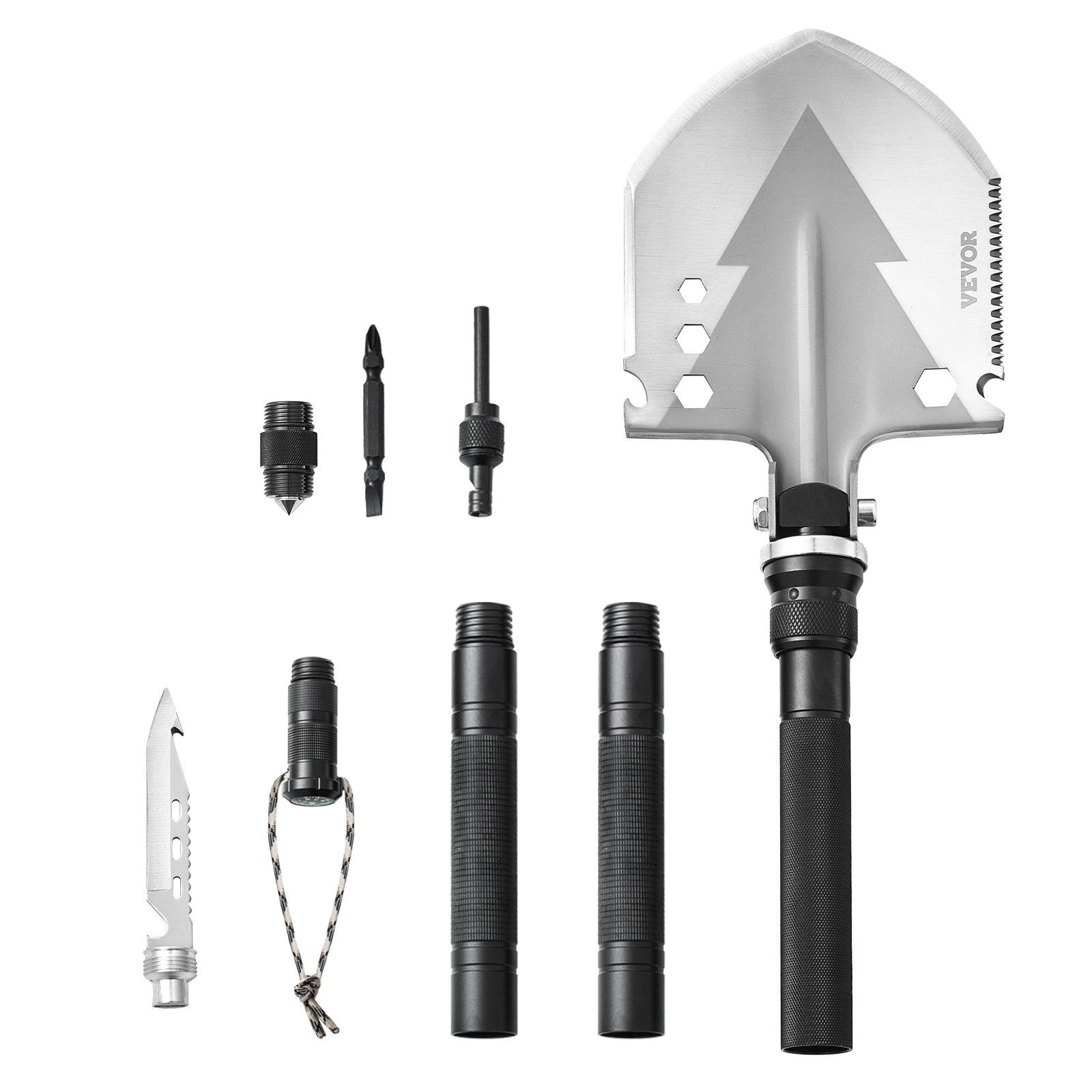 1.Versatile Camping Multitool Kit: This survival shovel includes a shovel, knife, compass, whistle, glass breaker, fire starter, and more-perfect for digging, chopping, fire-starting, cutting, signaling, and bottle-opening. It is a powerful tool with high practicality.