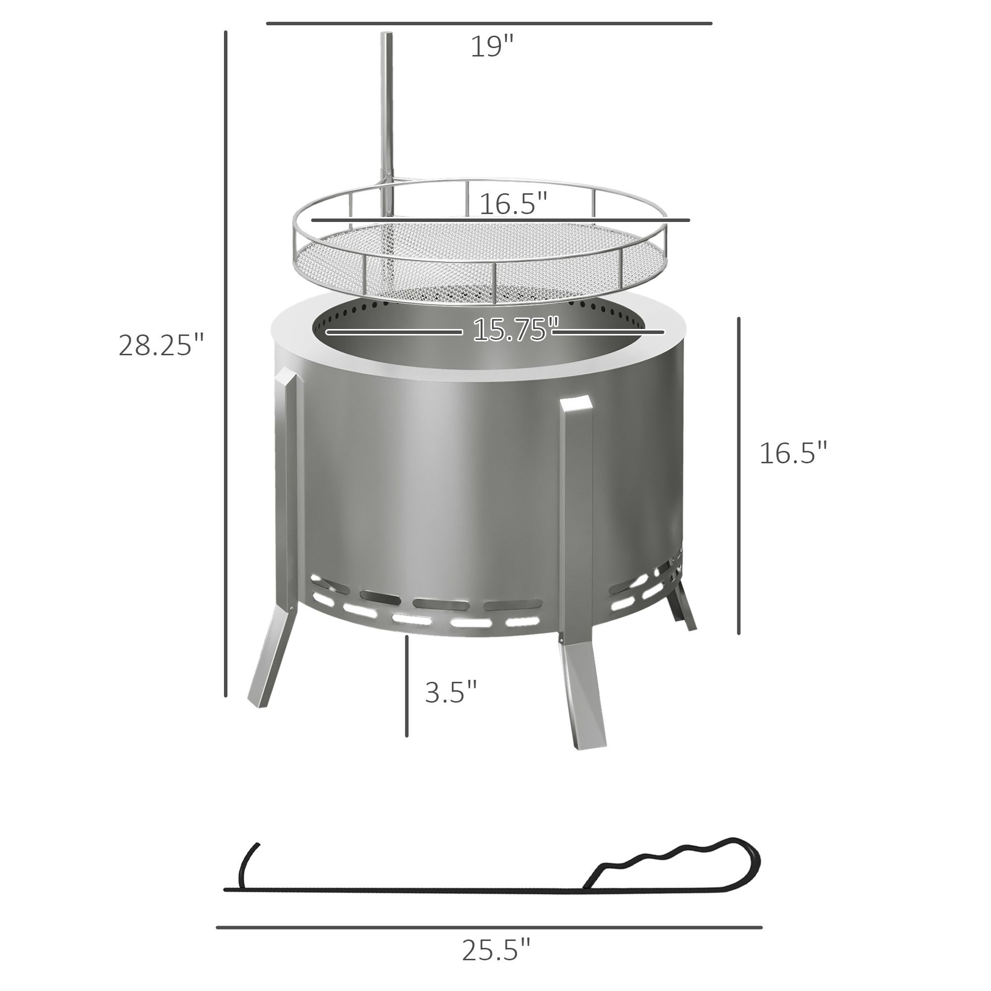 Smokeless Backyard Fire Pit with BBQ Grill Grate Info: Overall Dimension: 19" Dia. x 16.5" H. Inner Wood Burning Space: 15.75" Dia. Poker Length: 25.5".